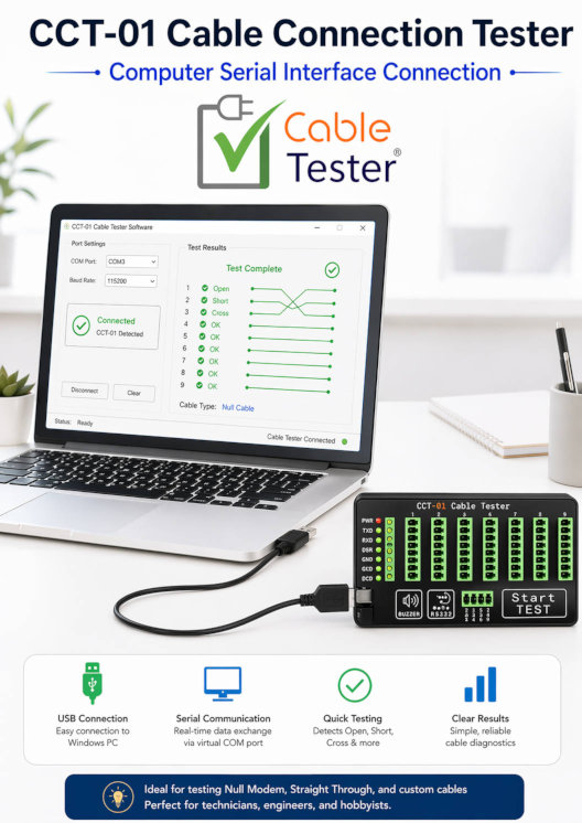 This page explains, in a simple way, how a computer can talk to the Cable Tester CCT-01 using its USB-C serial connection. It shows how the tester appears as a COM port, what serial settings to use, and how simple commands can be sent to make the tester perform actions such as checking a cable or learning a cable. The page also explains that the tester sends back text-based results, making it easier for users to understand and allowing developers to create their own software around it.